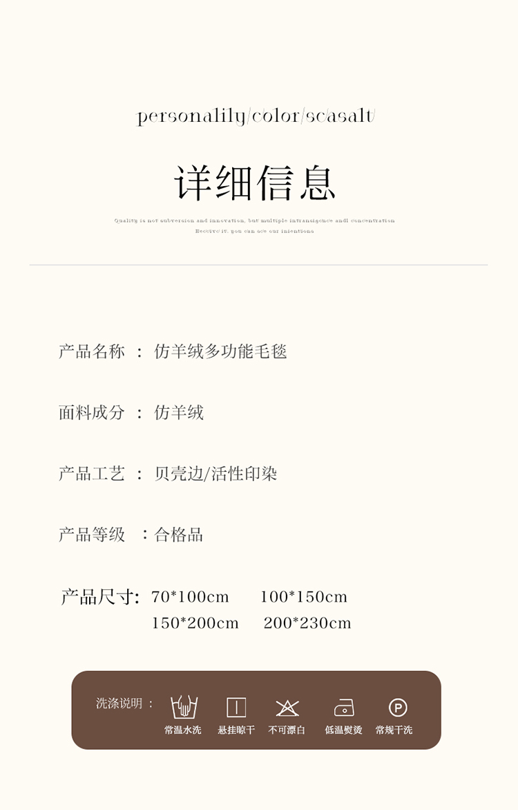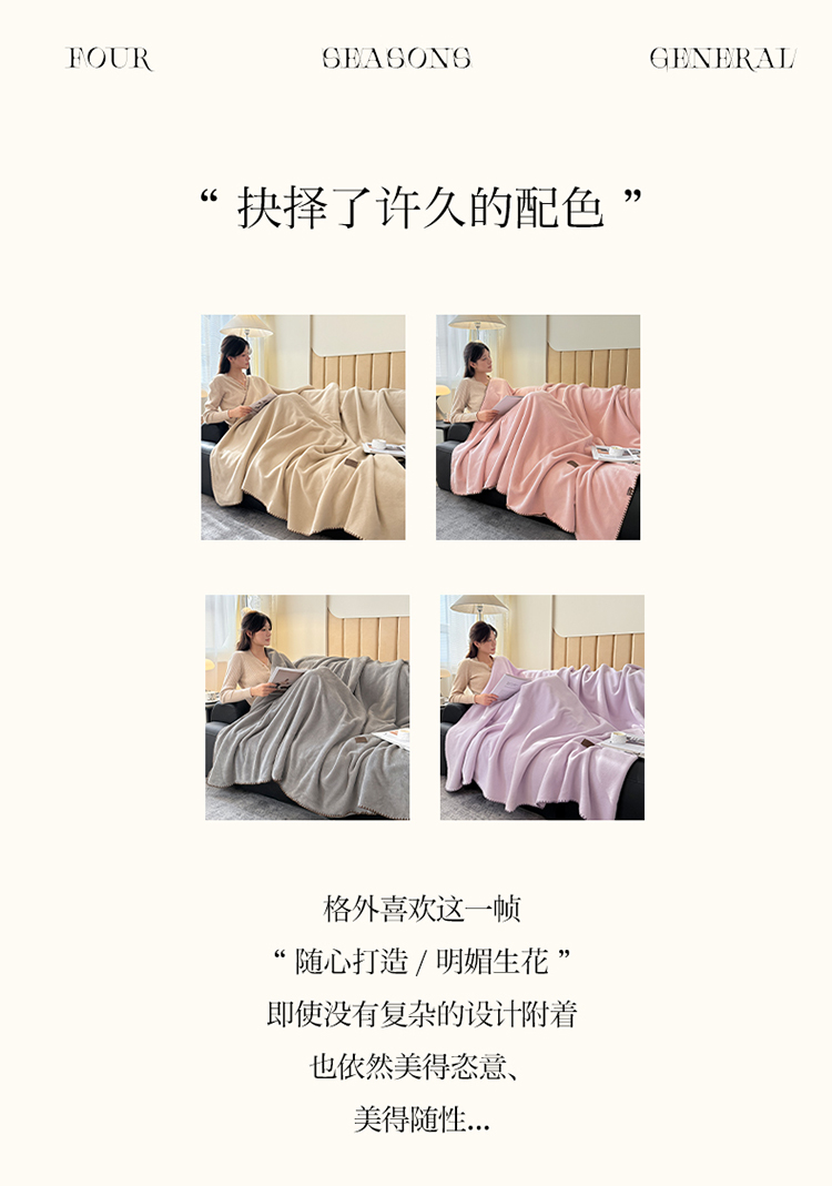 面料:仿羊绒 规格:150*200cm 一条四季的毯子,享受每个被爱包裹的瞬间,柔糯亲肤的呵护,是您在这个寒冷季节的伴侣,它将为您的每一天带来温暖与舒适。