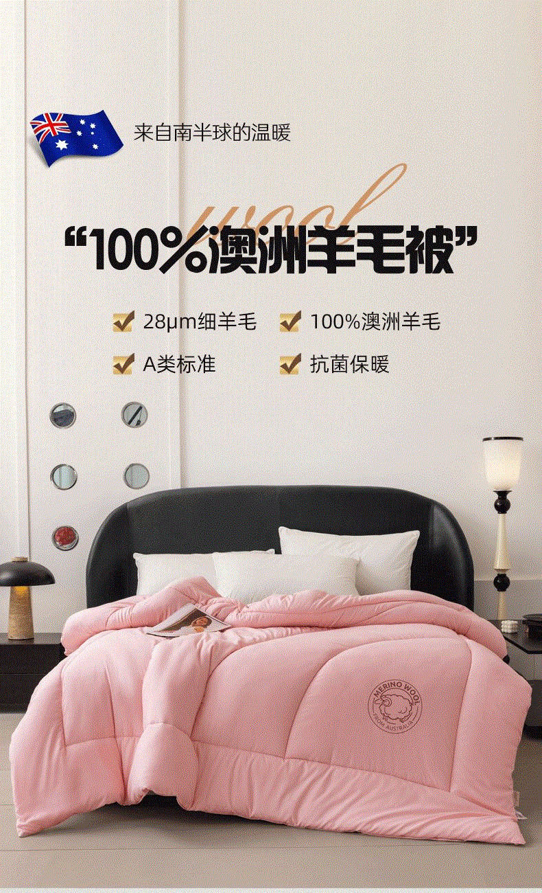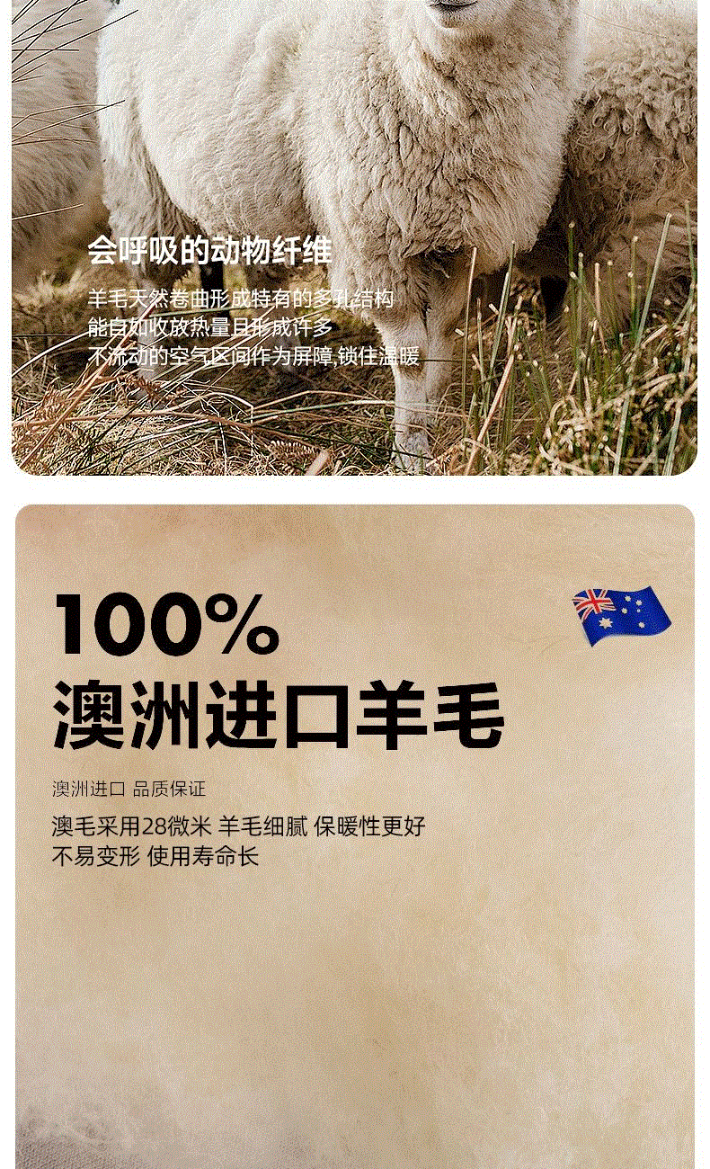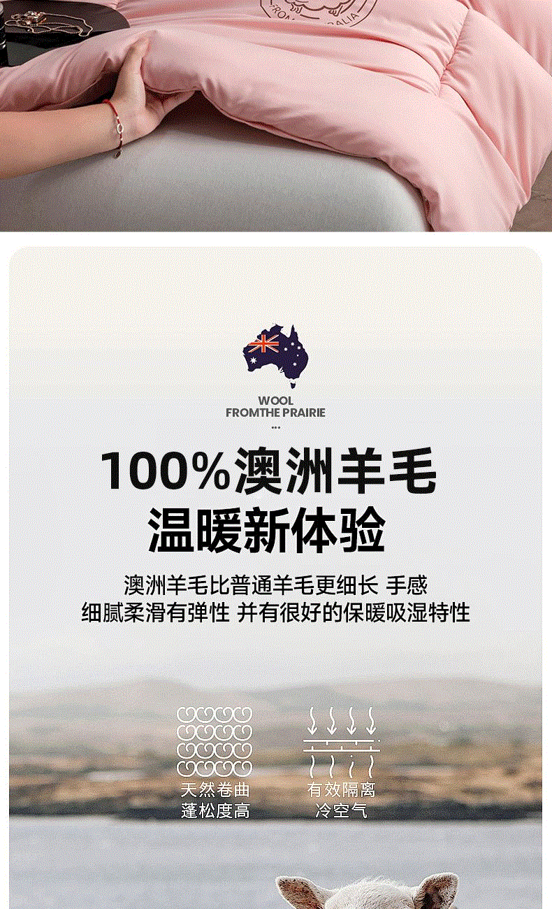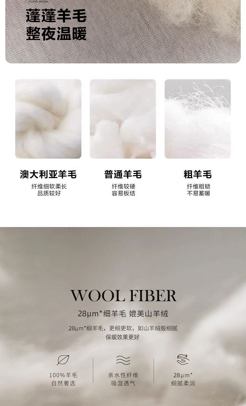 面料:柔赛丝 填充:澳洲羊毛 规格:2.0m 6斤 保暖舒适,乐享品质睡眠 多道工艺,羊毛洁净净化处理,褪去杂志,质地升华。 轻盈透气蓬松,蓄暖排湿,轻柔不压身。 加厚防雨布,防钻毛。
